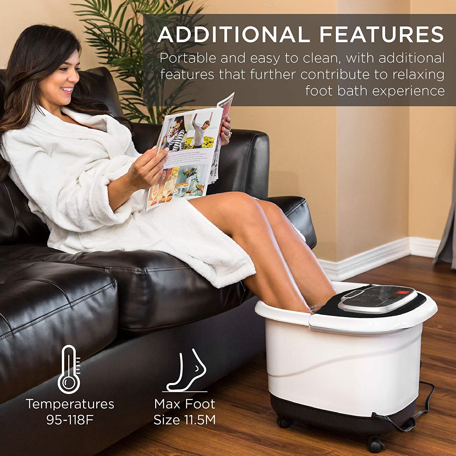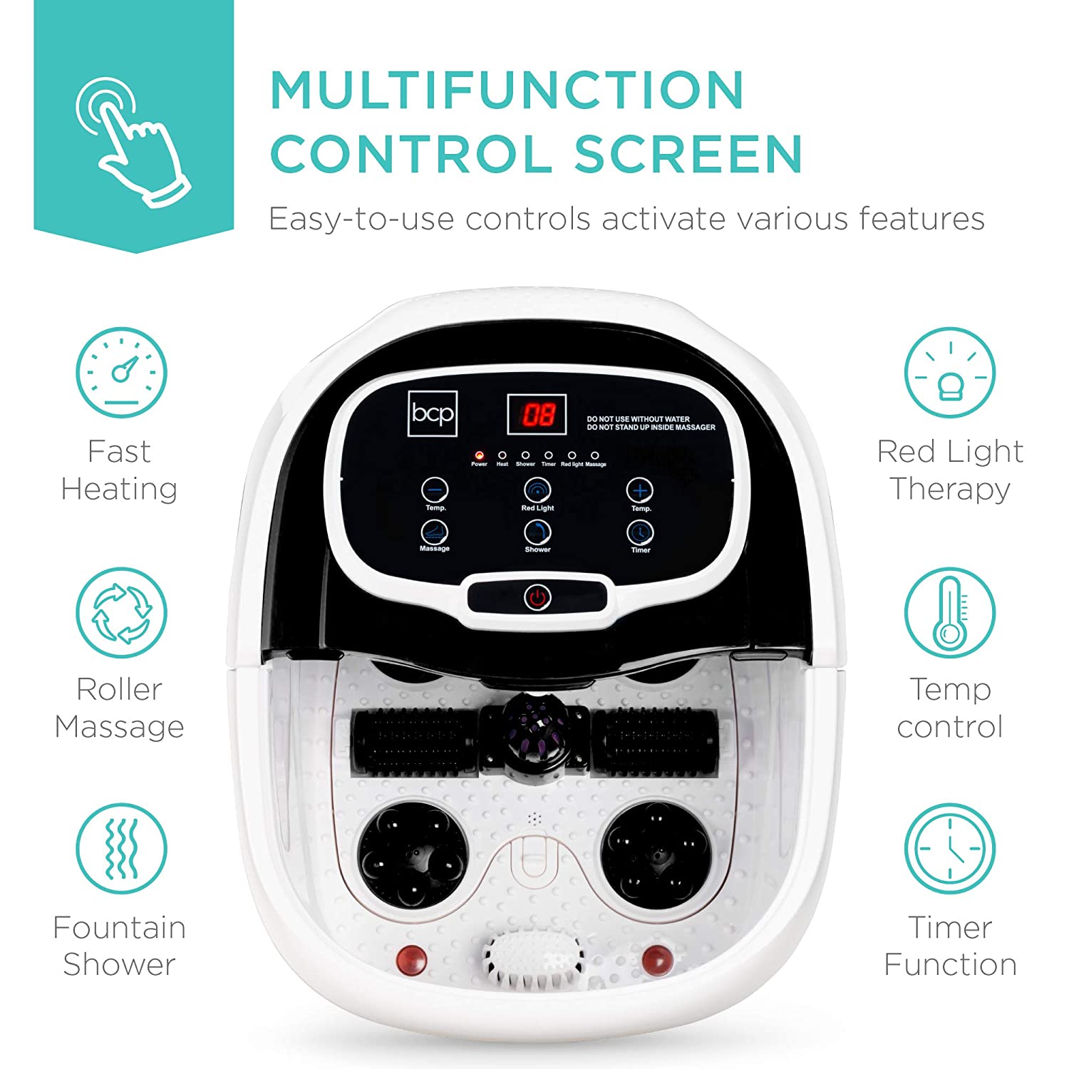 MULTIFUNCTION CONTROL SCREEN: Fast heating, roller massage, fountain shower, red light therapy, temperature control, and a timer function provide various ways to alleviate pain and discomfort in all areas of the foot