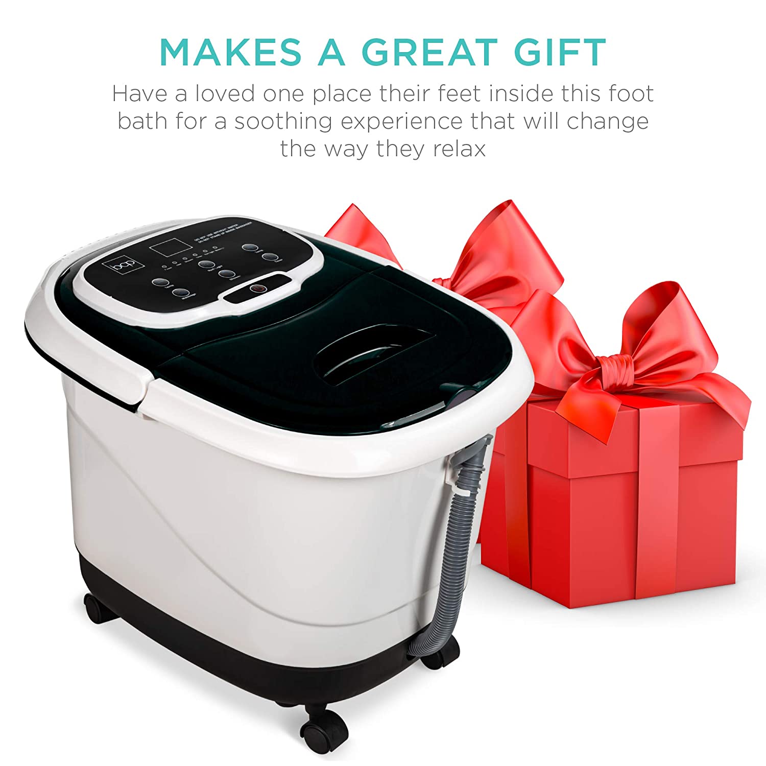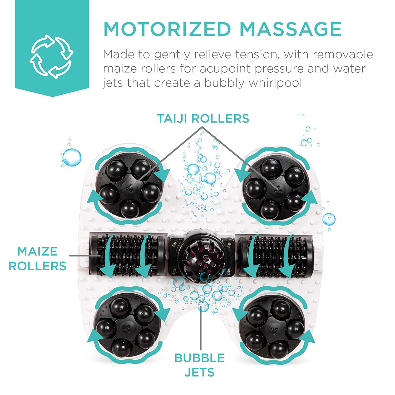 MOTORIZED MASSAGE: Automatic massage features gently relieve tension, with removable maize rollers for acupoint pressure that helps alleviate stress, plus motorized water jets that create a soothing, bubbly whirlpool