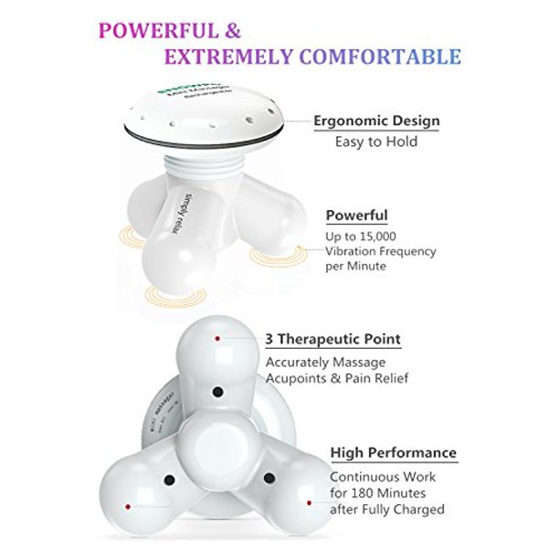 USB CHARGEABLE HAND HELD MASSAGER: The massager is perfect for travel and charge anywhere via the supplied USB Cable.The built-in rechargeable battery lasts for approximately a TOTAL of 180 minutes on a full charge!. Be able to charge-discharge for over 500 times with protection of over charging, over discharging, short-circuit and over-current. The mini massager is great for use on areas such as neck, back, shoulder, waist, hand,legs and foot.