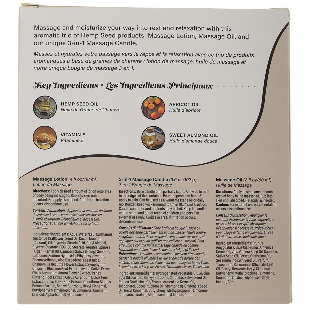 Enriched with hemp seed oil and vitamin E plus apricot and sweet almond oils, each piece of the Massage in a Box kit is 100% vegan and cruelty free, made with naturally derived ingredients.
