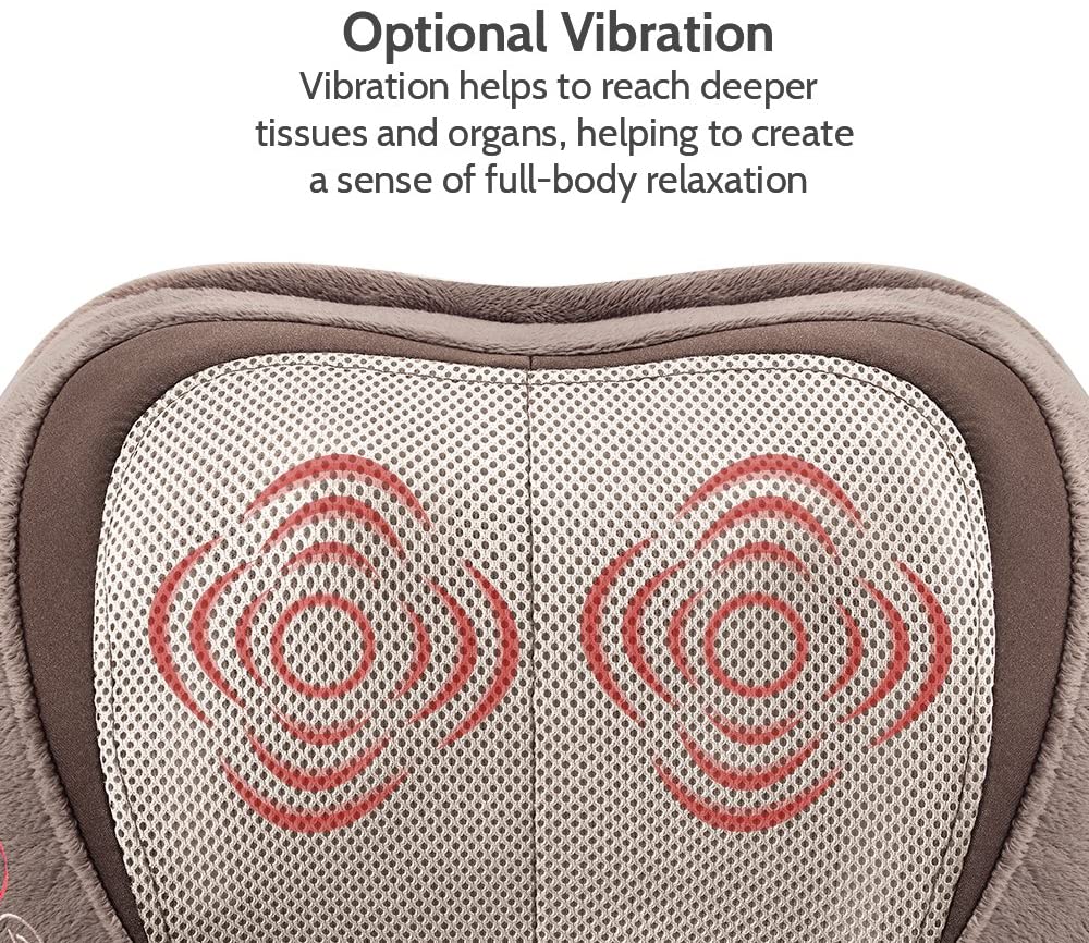 • OPTIONAL VIBRATION & HEAT: This 3D Shiatsu and Vibration Massage Pillow’s vibration and heat features will help to further relax your muscles and stimulate blood flow to sore muscles. The vibration feature helps to reach deeper tissues and organs, helping to create a sense of full-body relaxation. The use of heat helps to penetrate tired muscles in your upper back, lower back, neck, and shoulders. Turn the heat on to enhance your massage experience and soothe tired muscles