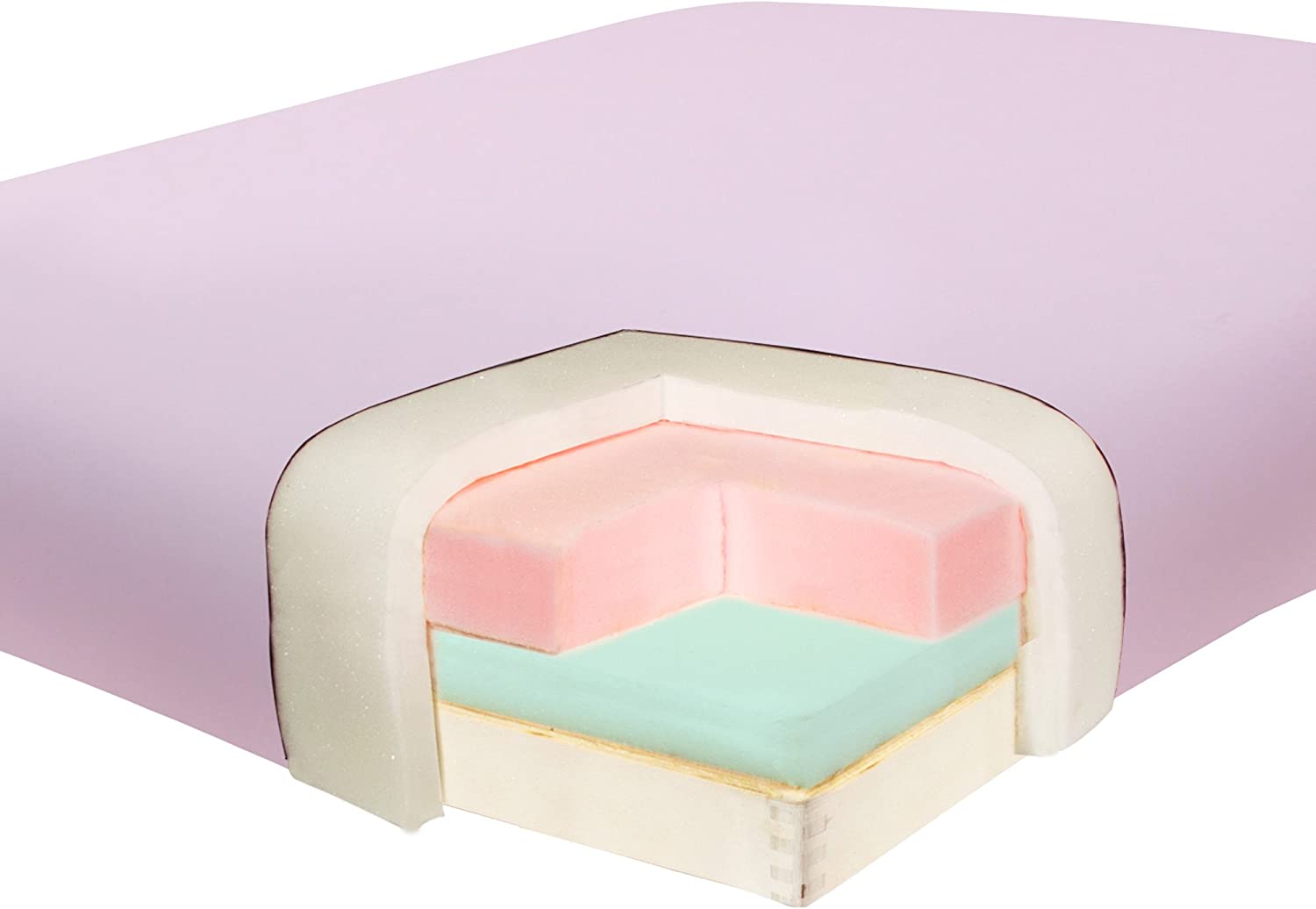 3” thick cushion of Multi-Layer Small Cell foam, which a layer of memory foam is included, upholstery backed by a 5 Year Guarantee.