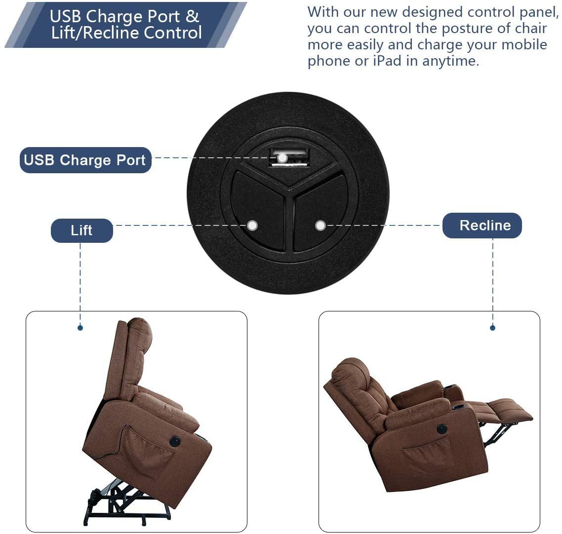 - ?????UL Approved Silent Lift Motor? – With our powerful silent lift motor, our lift chair can pushes the entire chair up to help the senior stand up easily without adding stress to back or knees. Design of right arm control button, our lift recliner chair reclines up to 150 degrees,the footrest and backrest are extended or retracted Simultaneously. You can smoothly adjust to customized position and stop lifting or reclining at any position you needed.
