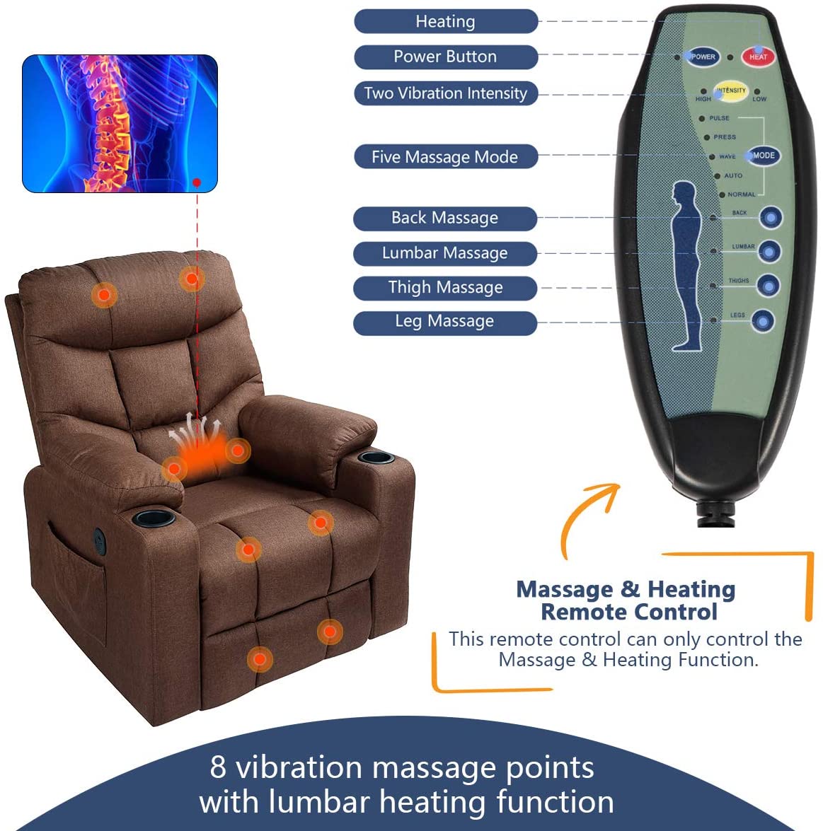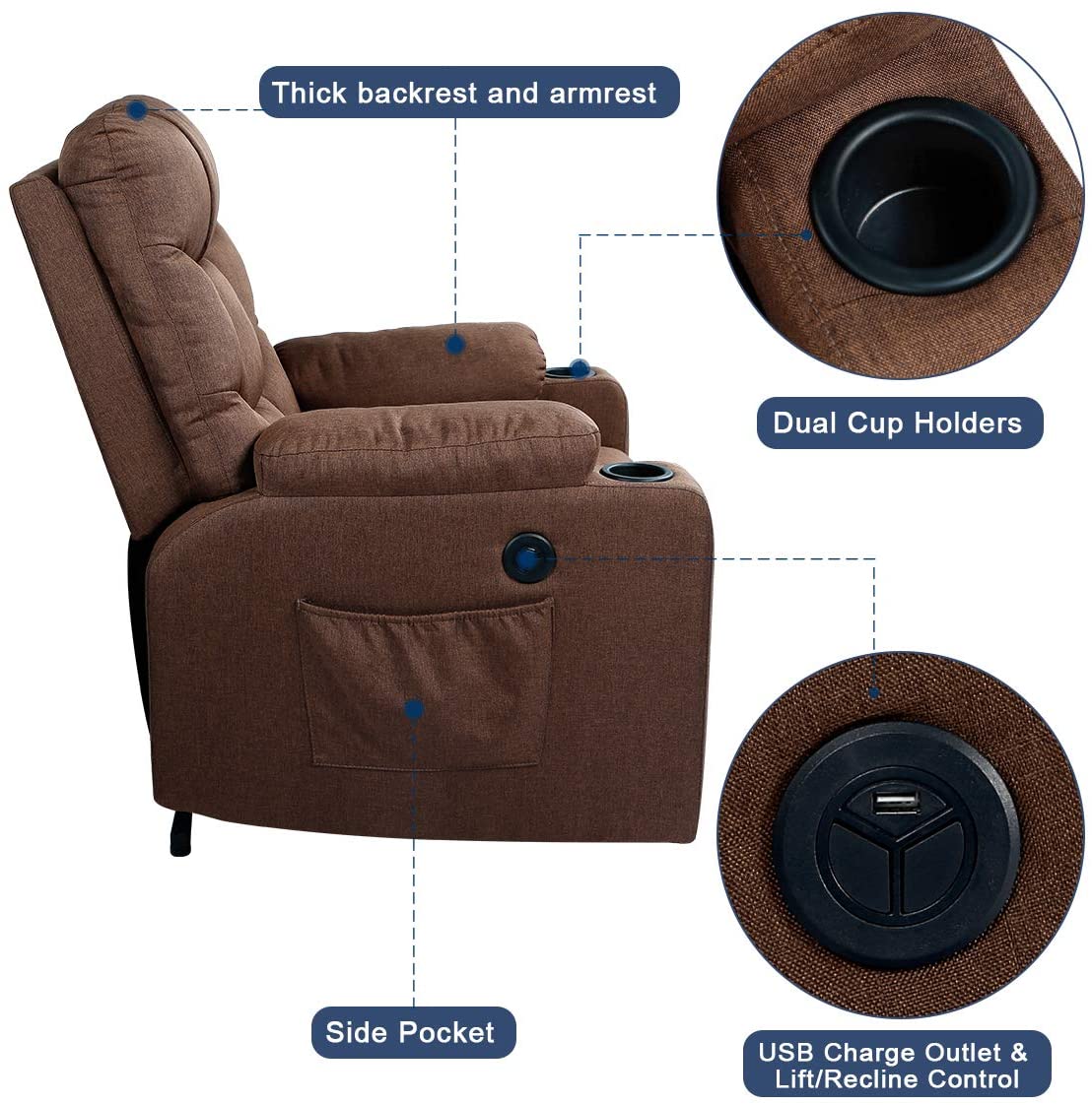 - ?????Heated Vibration Massage & USB Outlet? – This chair come with 4 areas of massage(shin, thigh, lumbar, head) and 5 modes( pulse, press, wave, auto, normal). Extra USB charging port will allow you charging your devices during you sitting or reclining. Which is functional for optimal comfort, perfect for reading, sleeping or napping. (Note:The USB ports ONLY for Low-Power devices, such as Phone, iPad or Headset.)