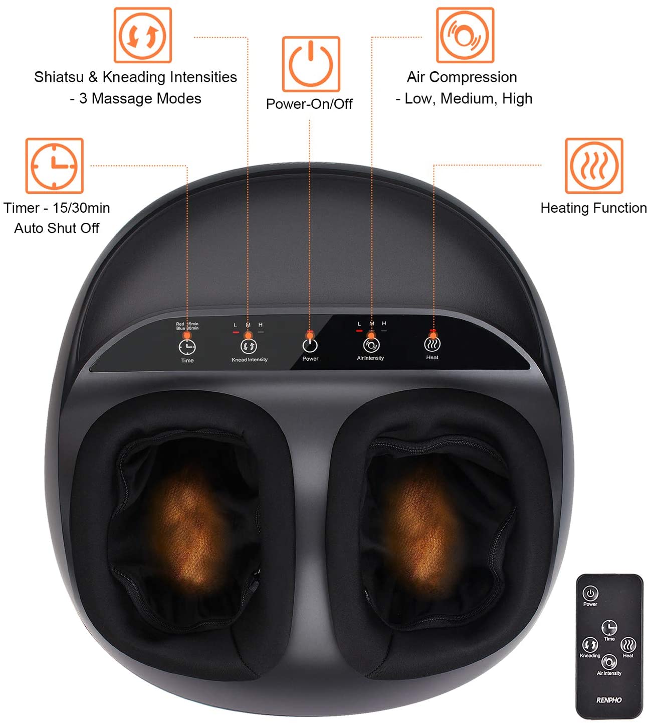 • Massage the feet, relax the whole body. Renpho foot massager machine, equipped with rotation ball, rolling stick, heating, offers a deep kneading Shiatsu foot massage. Note this item is not for foot bath use. No remote control. Not for people who are highly sensitive to squeeze and kneading.