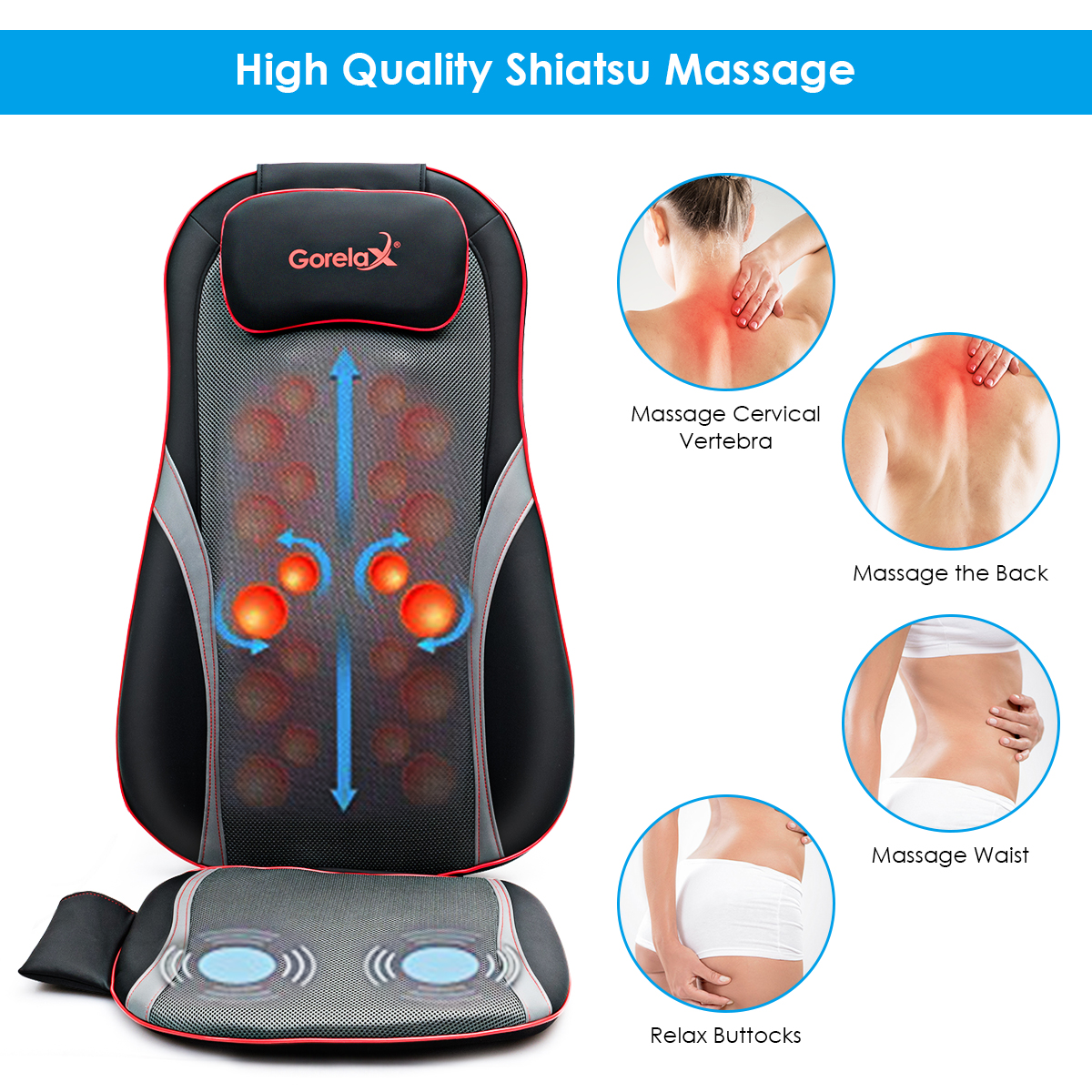hiatsu Neck Back Massage Seat Cushion w/ Hip Vibration & Heating Function
